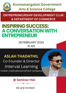 Entrepreneurship Development Club in association with Department of Commerce organises a meet the entrepreneur programme, ‘Inspiring Success: A conversation with Entrepreneur’ on 28-02-2025. Mr.Aslah Thadathil, the fouder memebr of Interval Learning, A mutinational EdTech company is the chief guest of the programme.